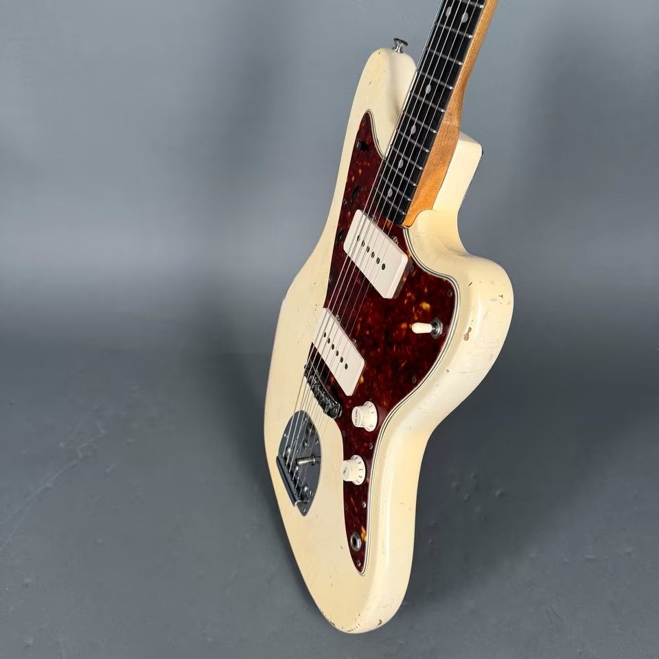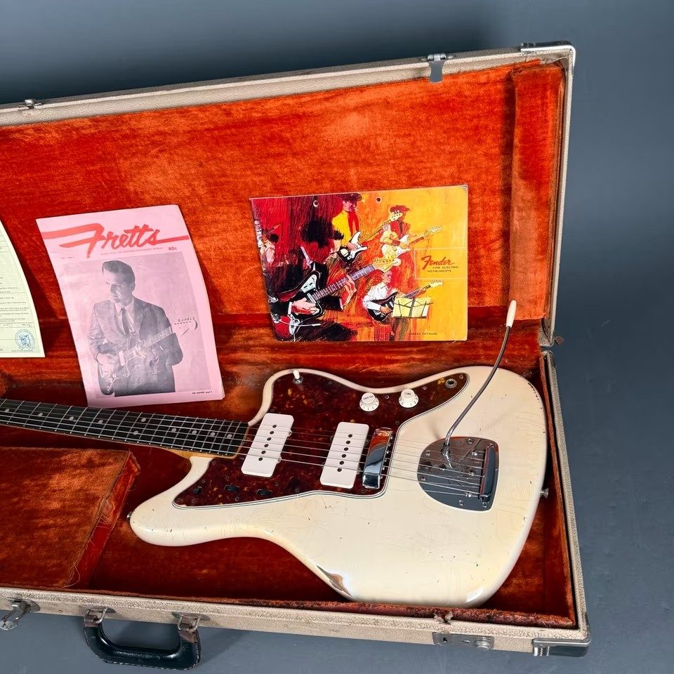Hier eine wunderschöne Fender Jazzmaster aus dem Jahre 1964 in altem white refin, sonst im Originalzustand inkl. einem Prospekt aus dem Jahre 1964 und im Original Koffer..