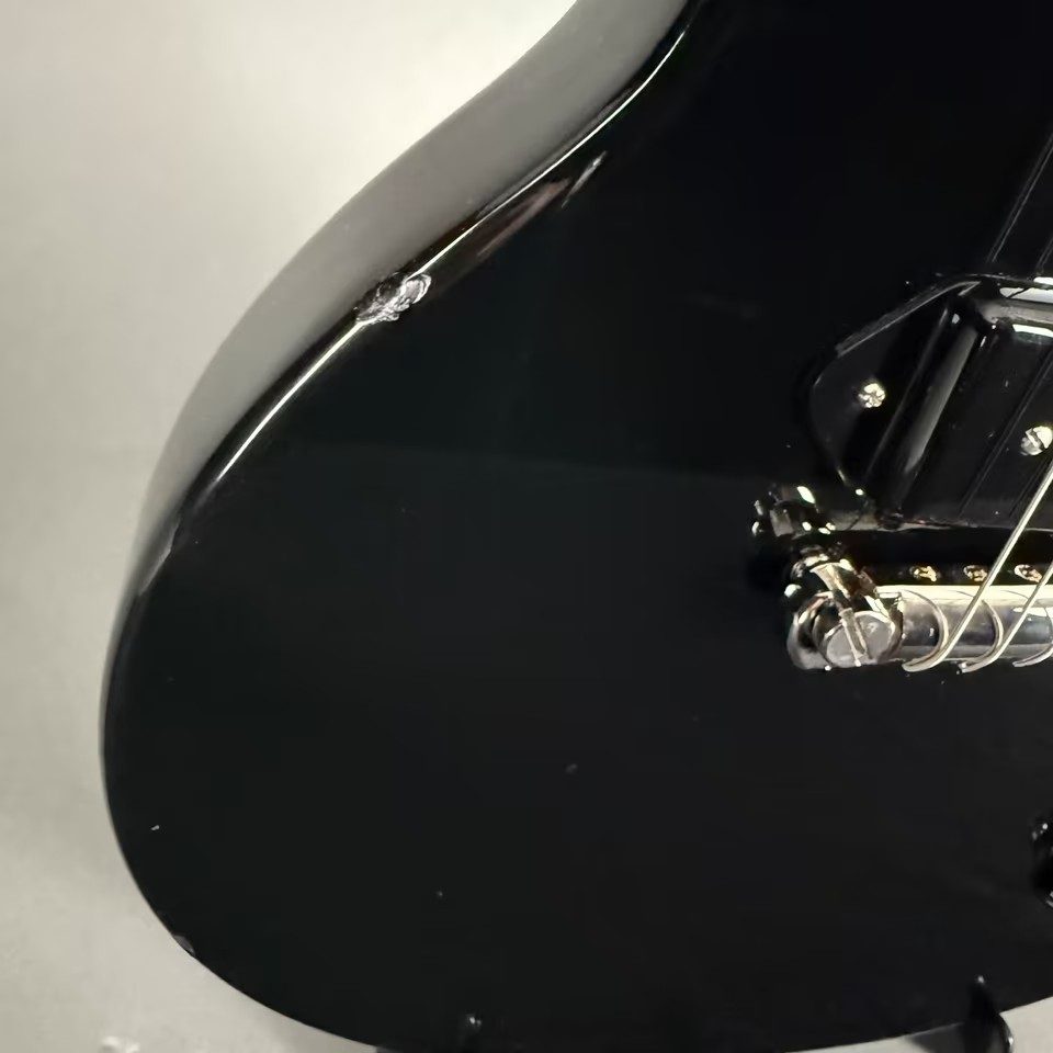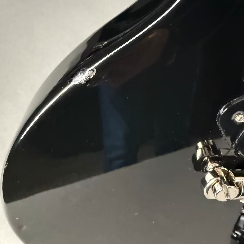 Hier gibt es 2 kleine Stoßschäden am Body/“Zargen“ … keine groben Kratzer, keine Riefen oder Kerben in den originalen Bundstäbchen oder gar im Griffbrett!