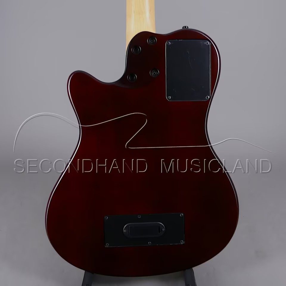 Neck: C-shape rock maple neck with 16″ radius ebony fingerboard & white side dots/fret lines. Godin diecast tuners are in perfect working condition. 1 1/2″ nut width; 34″ scale length. Neck is straight & truss rod works fine.
